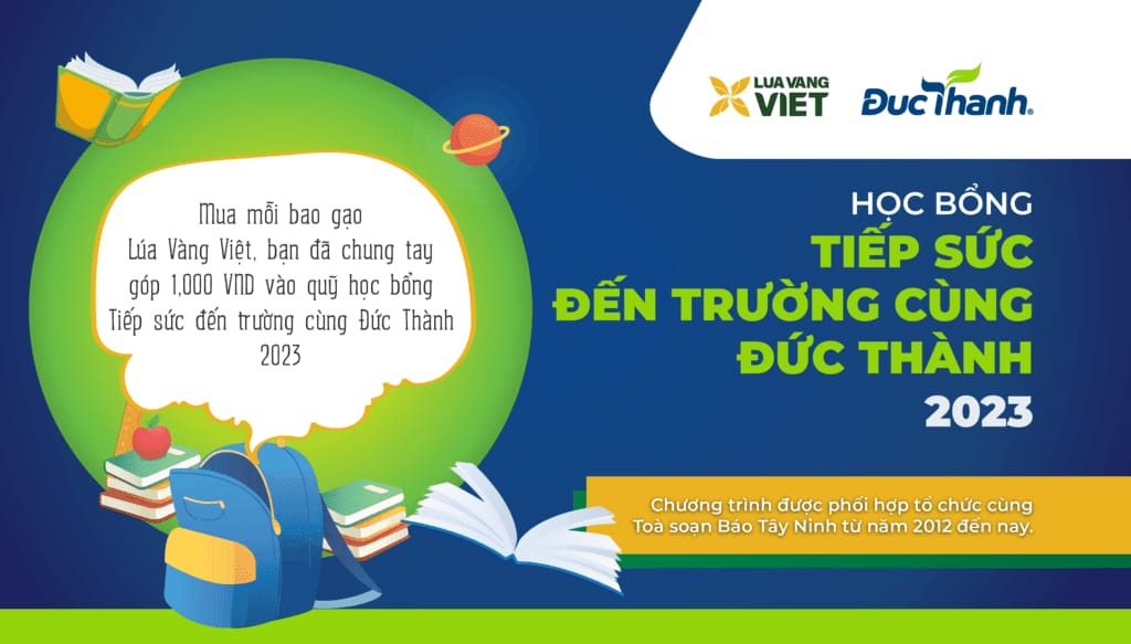 Học bổng “Tiếp sức đến trường cùng Đức Thành 2023” sẽ tiếp tục được triển khai năm 2023. Gạo Lúa Vàng Việt, kết hợp cùng công ty TNHH Đức Thành trân trọng gửi đến quý vị và các bạn thông tin chương trình học bổng đầy ý nghĩa này.Tiếp nối chặng đường 11 năm đứng ra tổ chức và tài trợ cho chương trình “Tiếp sức đến trường cùng Đức Thành” đồng thời chung tay góp sức khích lệ tinh thần chăm chỉ, vượt khó của các em học sinh.